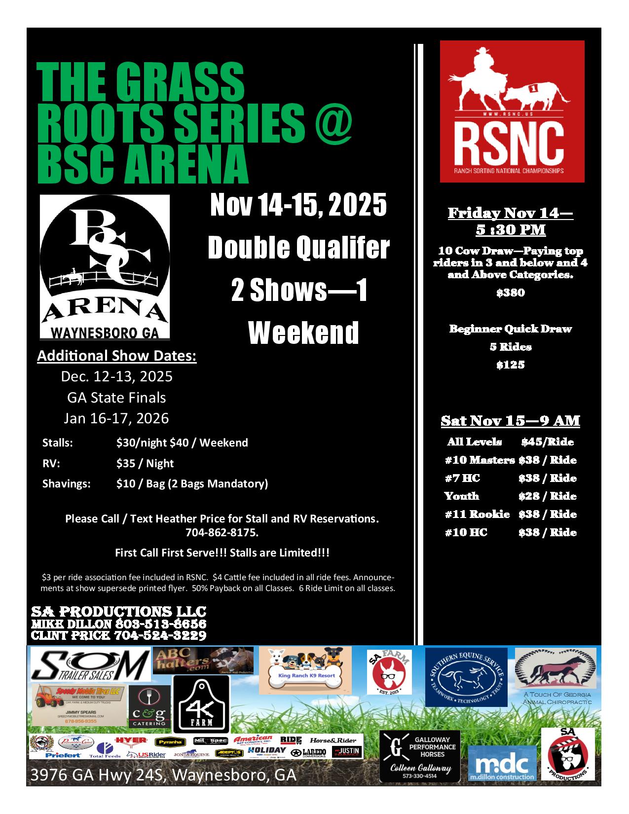 Georgia National Fairgrounds 401 Larry Walker Pkwy, Perry, GA, United StatesEarly Bird Stall Pricing: $145/stall/weekend rate or $40/night/stall for nightly rates. 2 bags of shavings required to be purchased per stall at the time of check-in. Additional Shavings will be sold on-site. Early Bird Stall Pricing ends Wednesday, January 15th. Stall prices will then be sold nightly at $40/stall/night. For RV Reservations, click here.